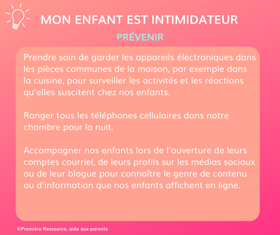 C’est pourquoi il est souhaitable de faire l’effort de rester informés pour prévenir la cyberintimidation et être capable de prendre les mesures adéquates au besoin.