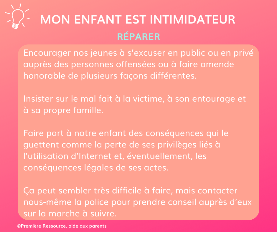 Que notre enfant soit victime, intimidateur ou témoin, s’il se confie à nous, on doit le remercier de la confiance qu’il vous accorde, l’écouter attentivement et réfléchir avec lui sur la conduite à adopter.
