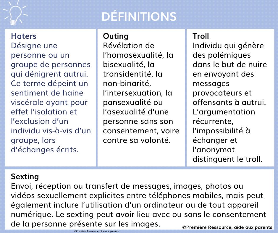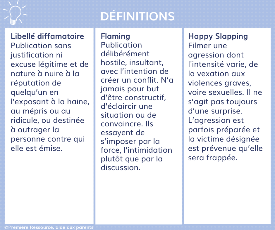 La violence verbale ou psychologique représente la forme la plus fréquente d’intimidation sur Internet. L’exclusion, la propagation de médisances et de rumeurs, le fait de rendre public du contenu censé être privé et se faire passer pour une autre personne sont des actes très répandus. C’est sur les médias sociaux principalement que les jeunes subissent l’intimidation : Instagram, Snapchat, TikTok, YouTube, What’s app, Messenger, Facebook, etc. Au deuxième rang, on retrouve les messages textes et les courriels. La cyberintimidation peut prendre plusieurs formes comme les menaces, les insultes, les injures, les fausses rumeurs, le vol d’identité, le harcèlement, la discrimination, le dénigrement, la diffamation, la filature ou l’exclusion en ligne, etc.